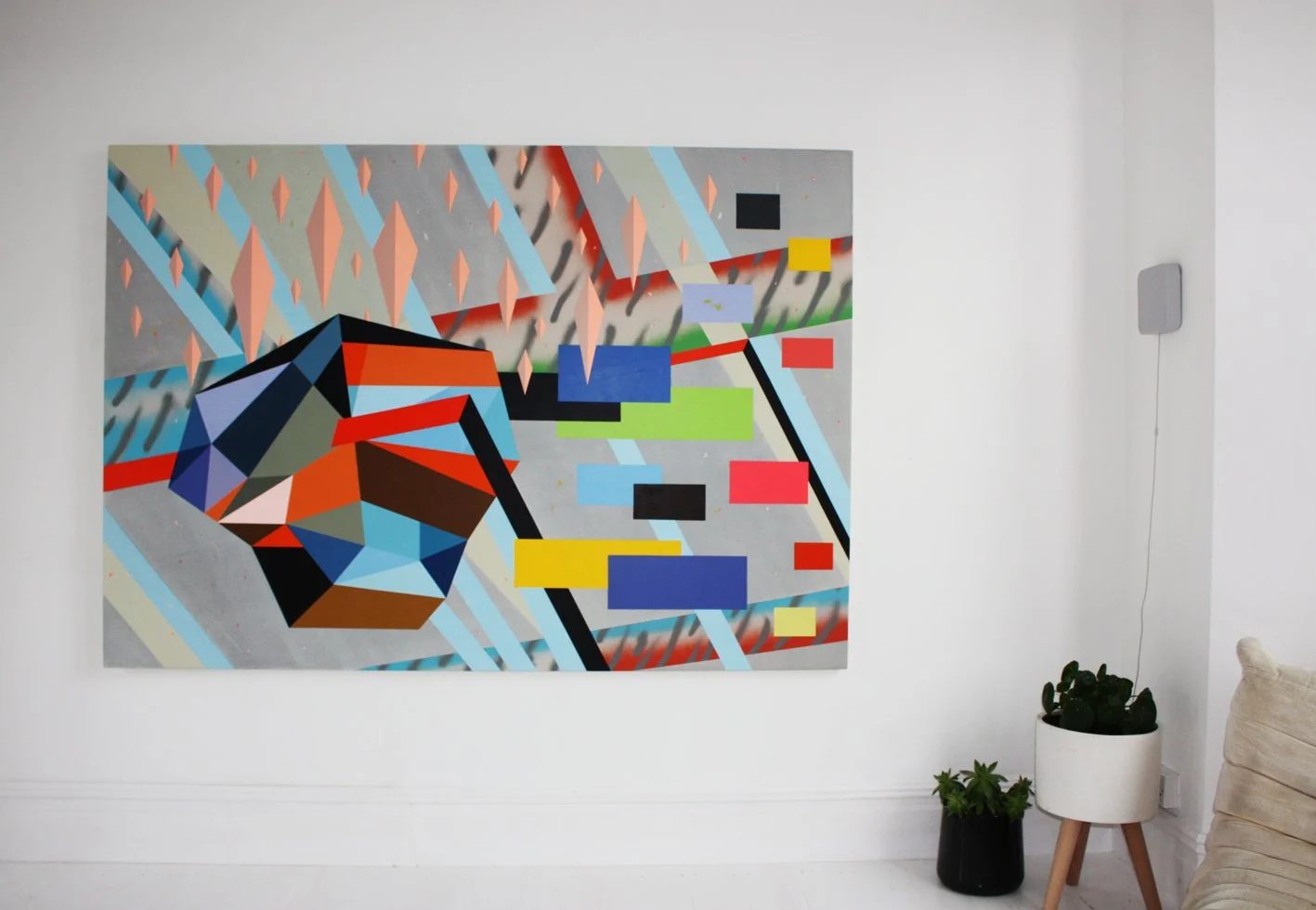 Although Stitt’s reputation was founded on his international career as a live artist, he originally trained as a painter in his home town of Belfast. In 2008 he was awarded a major Creative Wales award to develop his painting practice + has since radically changed his output to painting. His recent works are inspired by architectural blue plans + the structural + emotive qualities of the post war brutalist housing estate where he grew up.